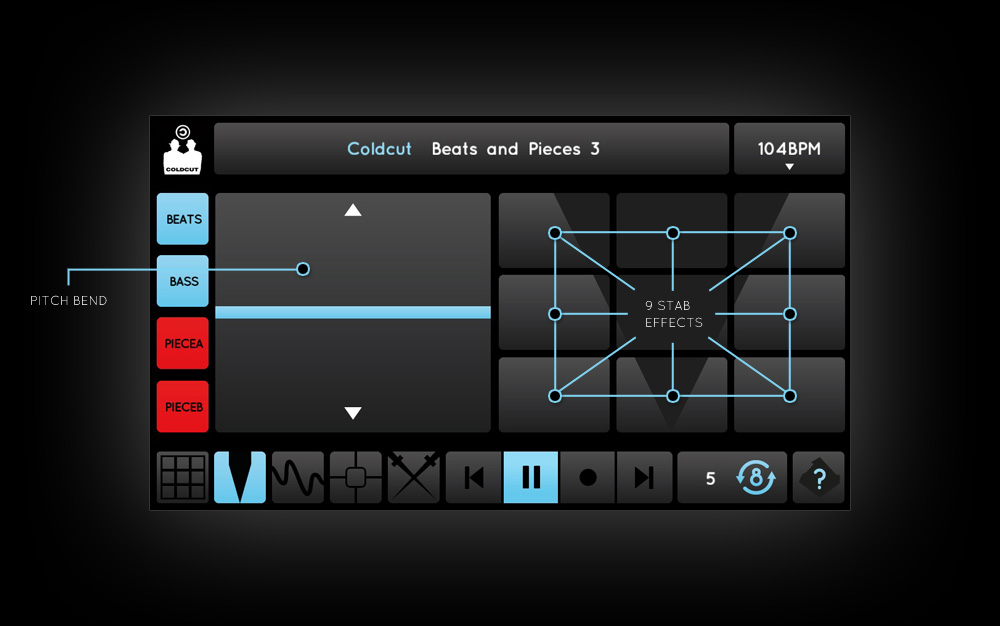 A matrix area which holds 9 'stabs'. These are short one shot audio samples, typically percussive noises, triggered by stab matrix pads. Includes 'Pitchfinger' slider that pitch bends currently played stab, wicked on scratching samples.